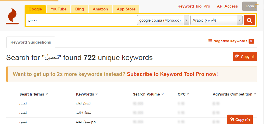 موقع يتميز بالبساطة و يقدم عدد كثير من كلمات مفتاحية الشائعة على اقوى محركات البحث كا جوجل و يوتيوب و بانج و محركات اخرى كما يمكنك ترقية حسابك الى pro اي مدفوع لكن هذه ترقية تتطلب دفع . هذا هو شيئ الجميل في الموقع انه يتعامل مع الكل الفرق بين حساب مجاني و المدفوع برو هو انك تحصل على مجموعة من مؤشرات كا اختيار بلد او اللغة البحث اما بالنسبة للمجاني يتيح لك تحكم فقط في اي نوع من محركات بحث